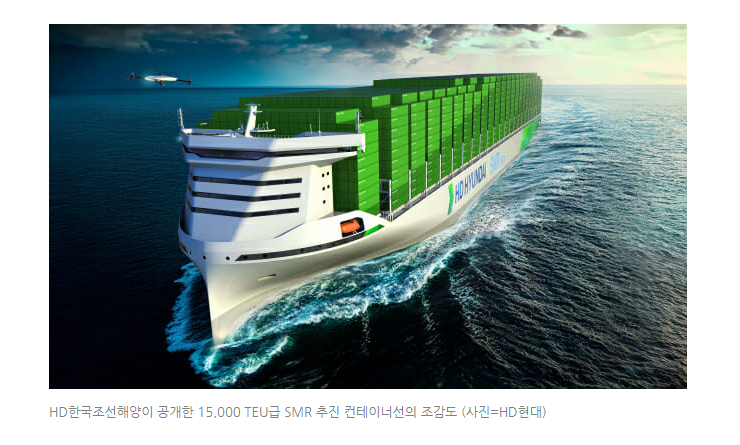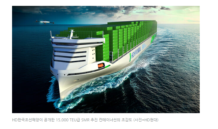 한국조선해양이 SMR 소형모듈 원자로를 내재하는 추진 컨테이너선 조감도를 발표했다.
