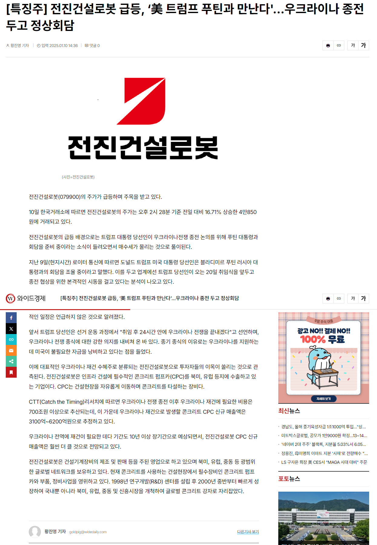 특징주 전진건설로봇 급등, 미국 트럼프가 푸틴과 만난다.